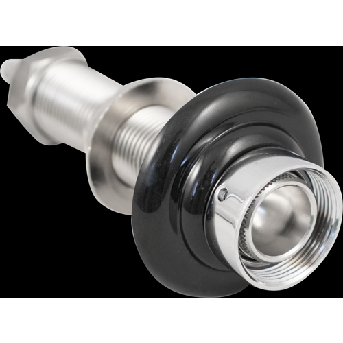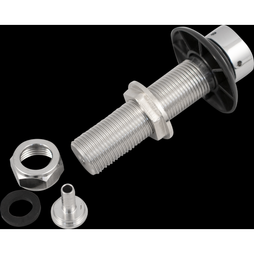 Comes with a back nut, plastic collar, hex nut, and a 1/4" barb. Requires a 1" hole saw for installation. Due to the length of the back nut and collar, the total length of the shank will be about 2 3/4".